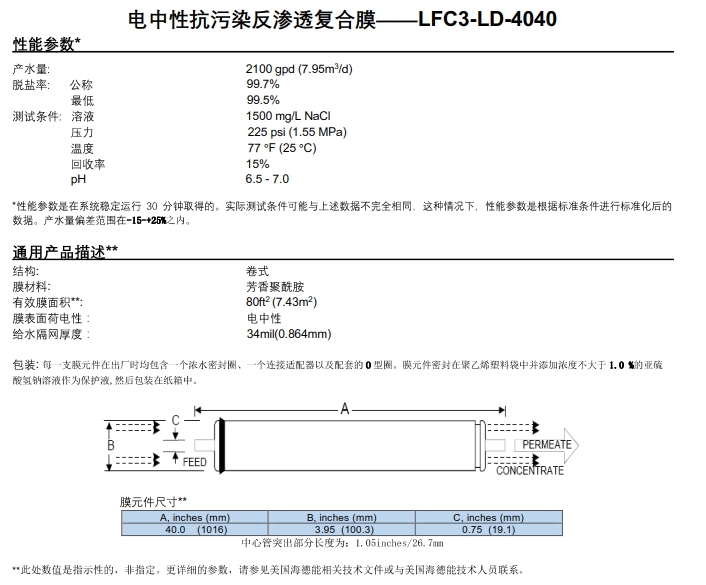 电中性低污染高脱盐反渗透膜--LFC3-LD-4040